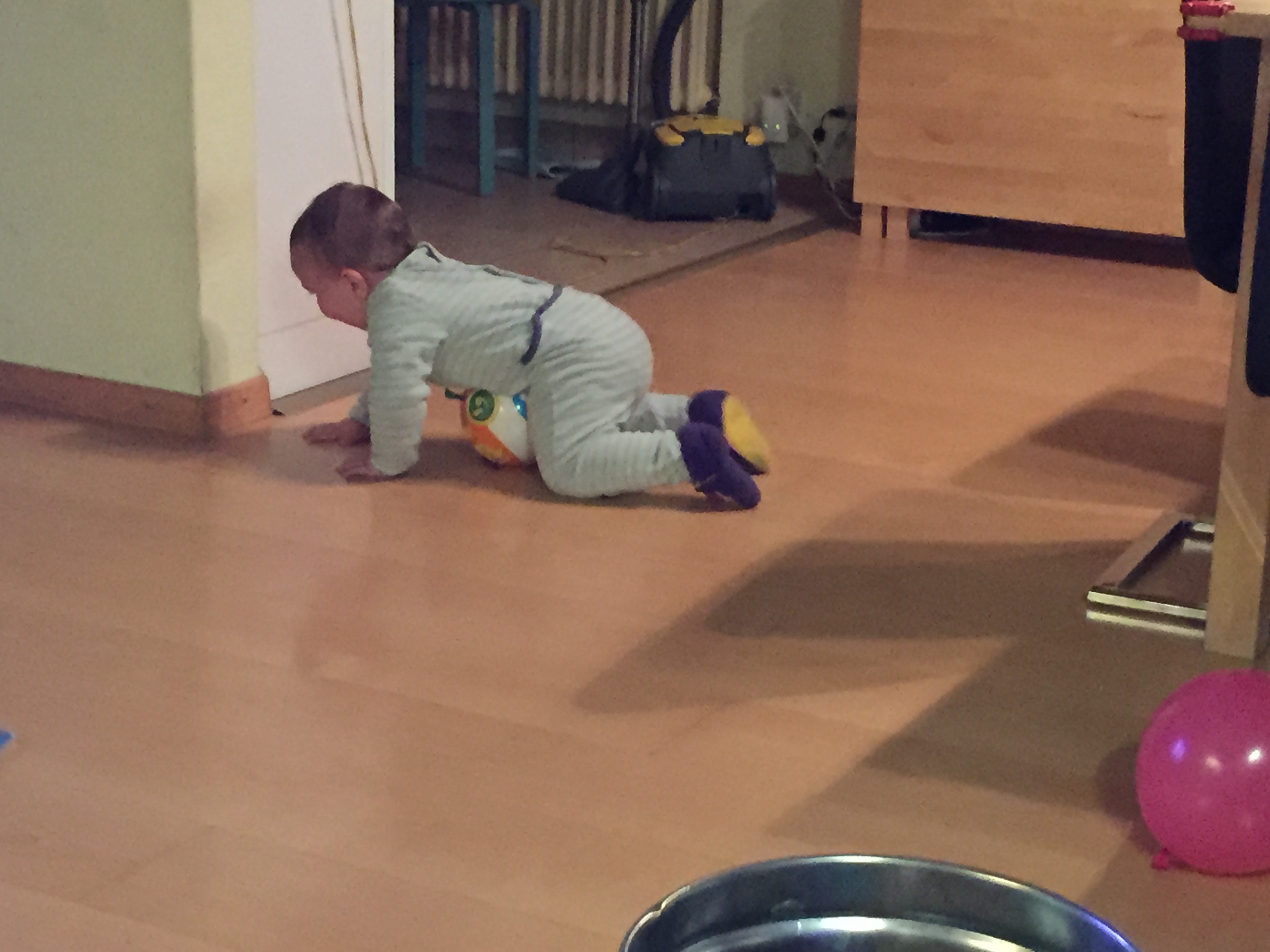 Inédits, ces moments que les jumeaux passent seuls chez nous se déroulent dans une ambiance toute particulière, calme et sereine. Ils se sont manifestement plu à jouer là, tantôt « ensemble » (c’est encore un bien grand mot, mais ils jouent parfois côte-à-côte sans se piquer les affaires mutuellement), tantôt chacun de son côté en sentant notre présence attentive auprès d’eux. Du coup, ils n’ont pas trop apprécié, l’heure en étant venue, de devoir aller se coucher… et l’ont bien fait remarquer en renâclant un peu avant de dormir !