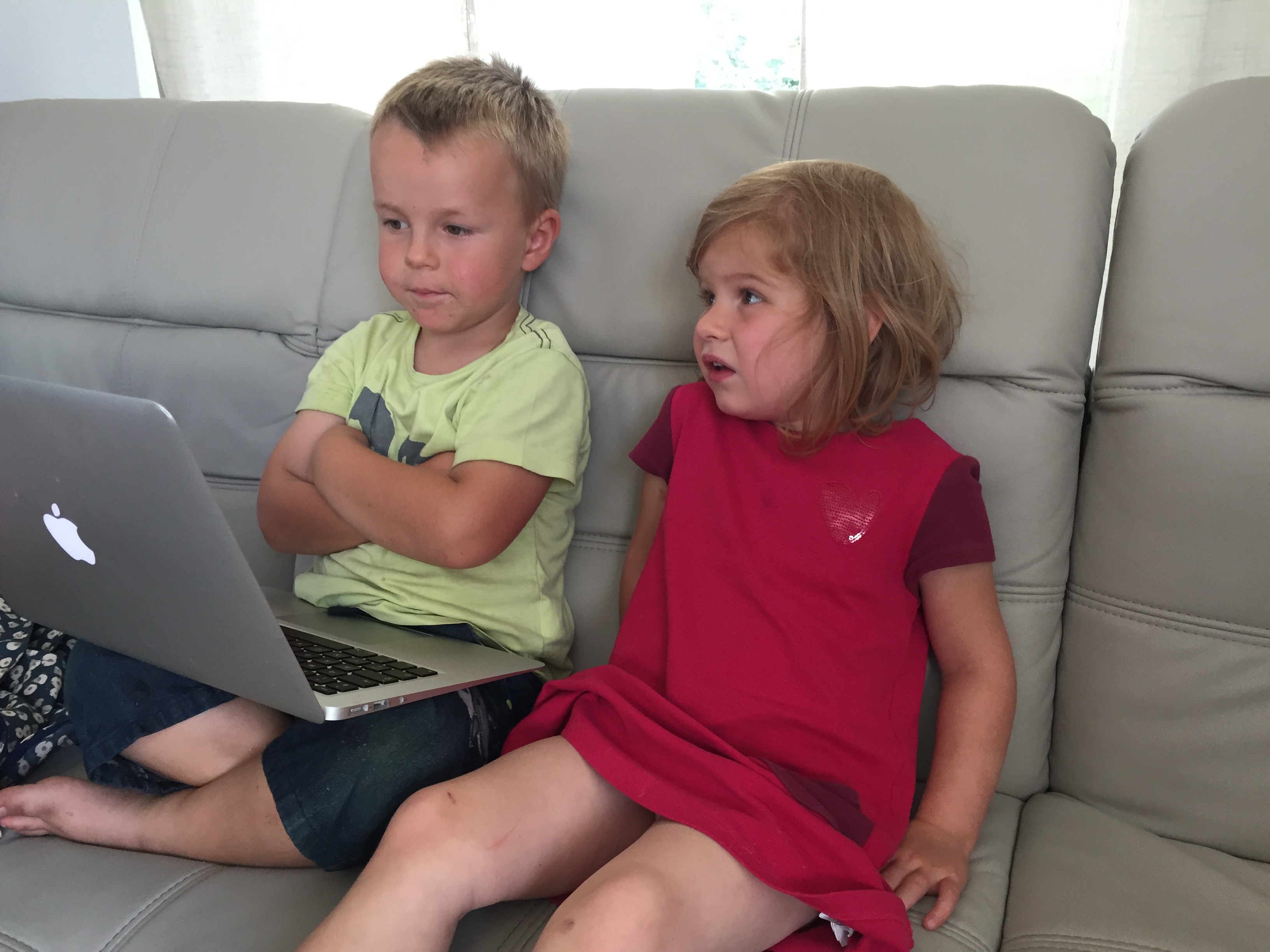 Robin, Malo et Céleste font fête à Grand-maman à son arrivée. Il lui est difficile de les prendre les trois dans les bras, d’où cette solution de fortune.